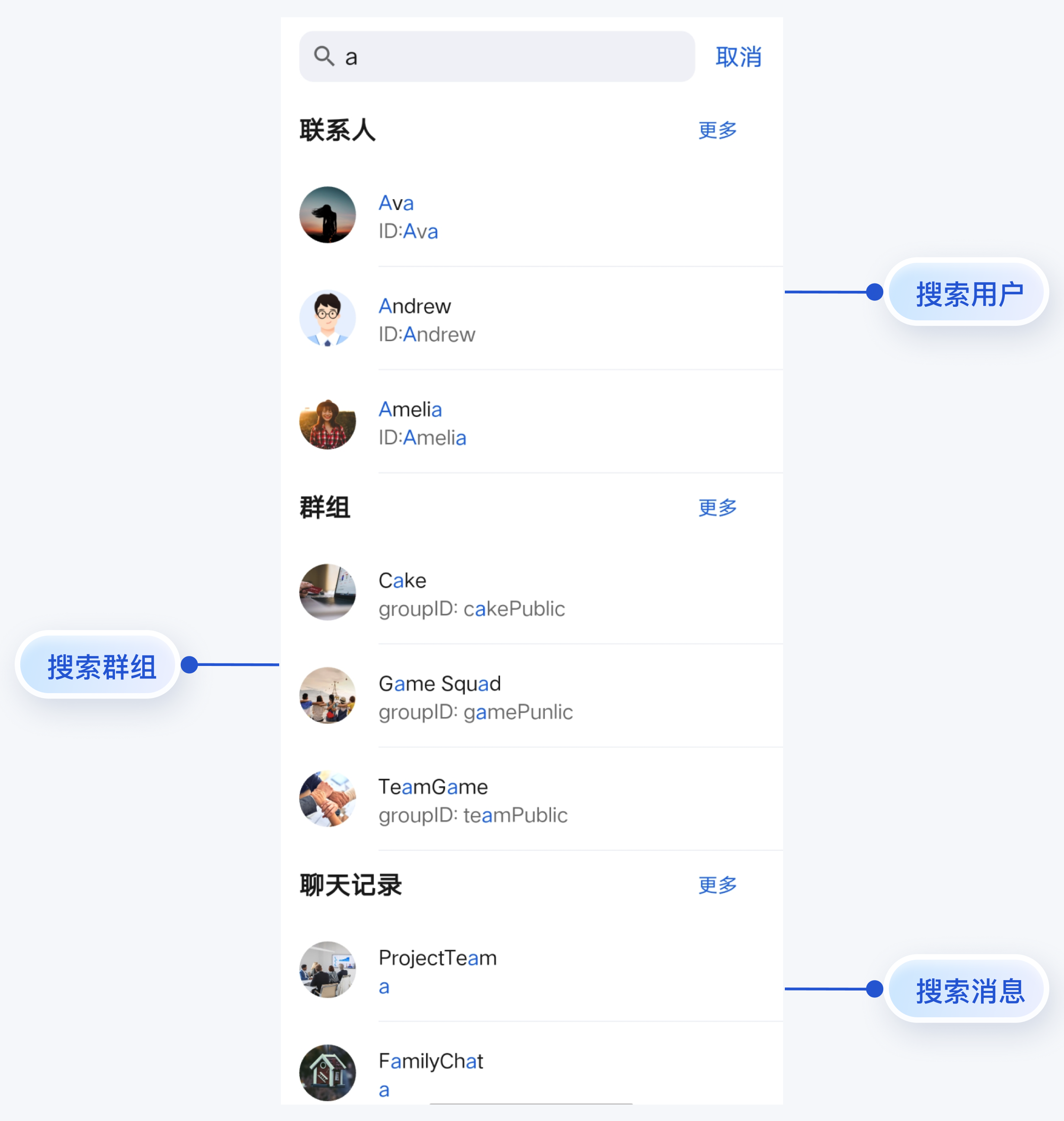 Search 是搜索组件,为用户提供搜索框、搜索结果展示、界面跳转等功能的完整组件集合。该组件支持用户搜索、群组搜索、消息搜索等功能,并提供了丰富的交互回调接口。