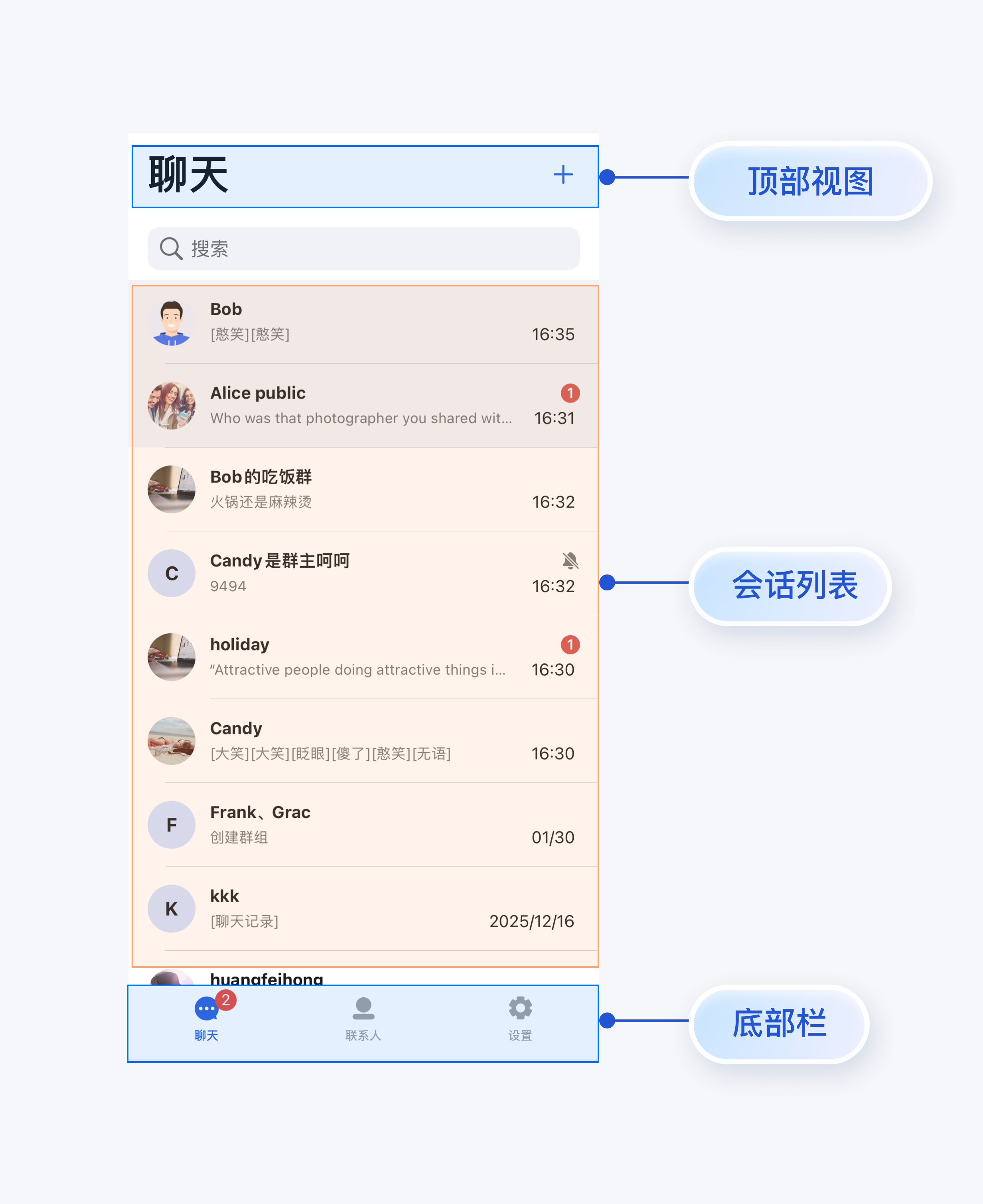 您可以将 ConversationList 直接集成到现有的 App 页面中,也可以新构建一个完整的会话列表页,组装后的一种 UI 效果如下图所示: