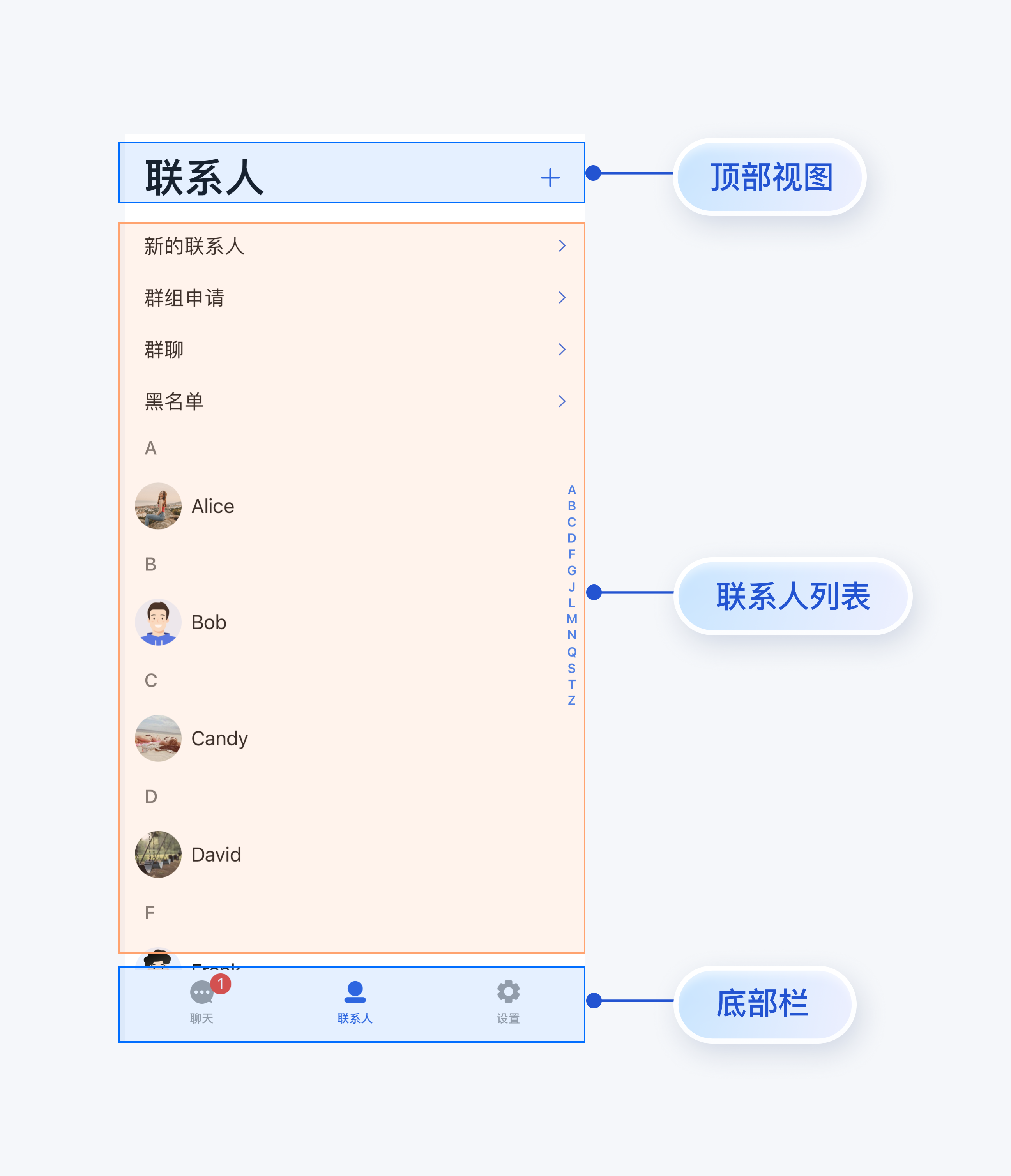 您可以将 ContactList 直接集成到现有的 App 中,也可以新构建一个完整的联系人列表页,组装后的一种 UI 效果如下图所示: