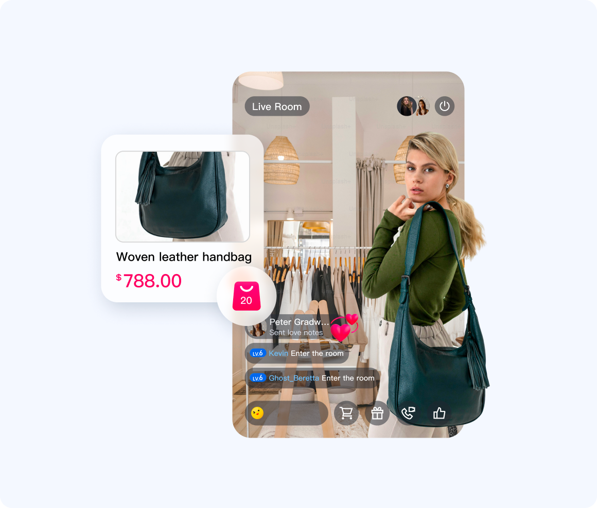 在电商直播中,主播正在讲解一款商品。此时,所有观众的直播画面下方都会弹出一张商品卡片,实时展示该商品的图片、名称和价格。当主播切换讲解下一件商品时,所有观众端的卡片都会自动、同步更新。