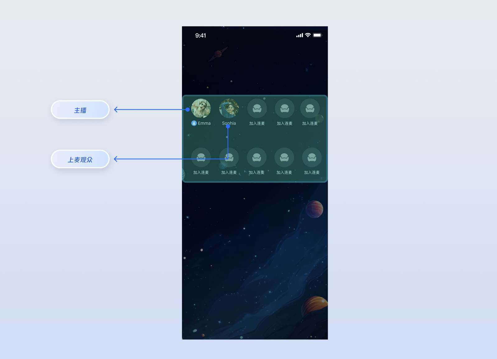 LiveCoreWidget 作为核心组件来渲染主播和连麦观众的视频流。UI 的重点是处理视频画面的布局、大小,以及通过 VideoViewDelegate 在视频流上添加挂件(如昵称、占位图)。您可以同时打开摄像头、麦克风。语音房(语聊房):核心是麦位网格。您不会使用