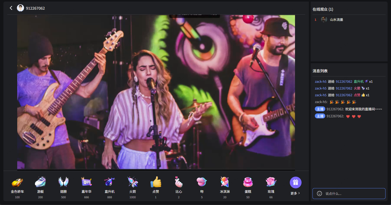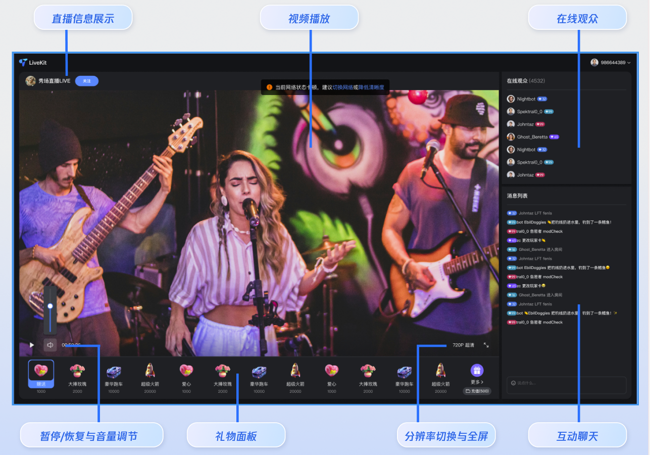 默认的观看页面效果如下图所示,主要包括:直播信息展示、视频播放、礼物面板、在线观众、互动聊天、播放控制等功能。