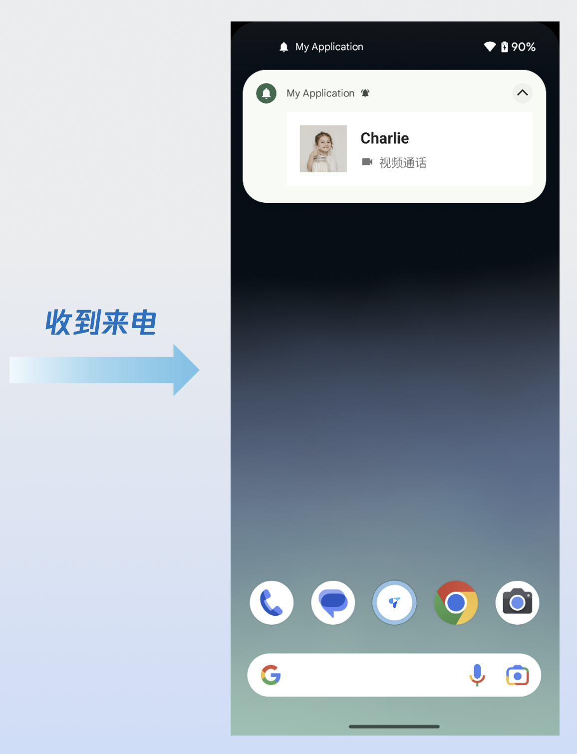 2. 展示来电通知:当收到 onCallReceived 事件后,根据该事件携带的通话信息展示通知界面。在 onCallReceived 回调中,根据事件携带的通话信息,并调用自定义的推送通知(参考步骤 2)进行展示。