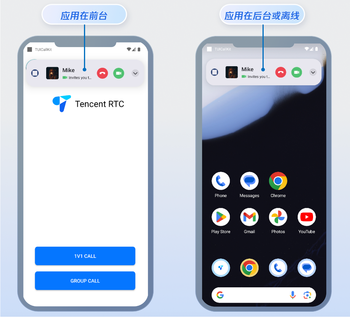 在 Android 平台,当您的应用进程被杀死或处于后台时,若收到音视频通话邀请,对方将无法收到任何通知,导致通话无法接通。因此,集成离线推送是确保您的音视频通话功能可用的必要条件(用户呼叫始终在线的 Web 端坐席等特殊情况除外)。本文档将指导您完成 FCM Data Message 的推送集成步骤。即使应用未运行,也能将通话邀请等关键信令送达设备,从而唤醒应用并启动通话界面。