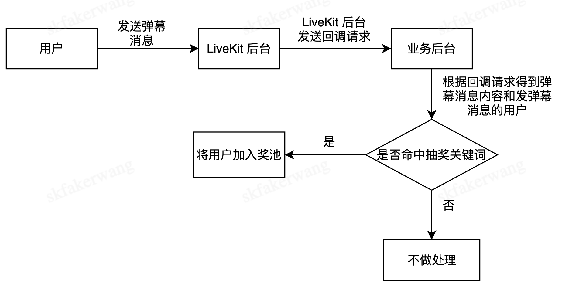 直播间弹幕抽奖是指用户发送特定内容的 弹幕消息 参与直播间抽奖。实现思路为业务后台群内发言消息后回调请求获取弹幕消息内容,符合特定内容的消息发送者将加入奖池,否则不做处理。回调使用参见 群内发言之后回调。