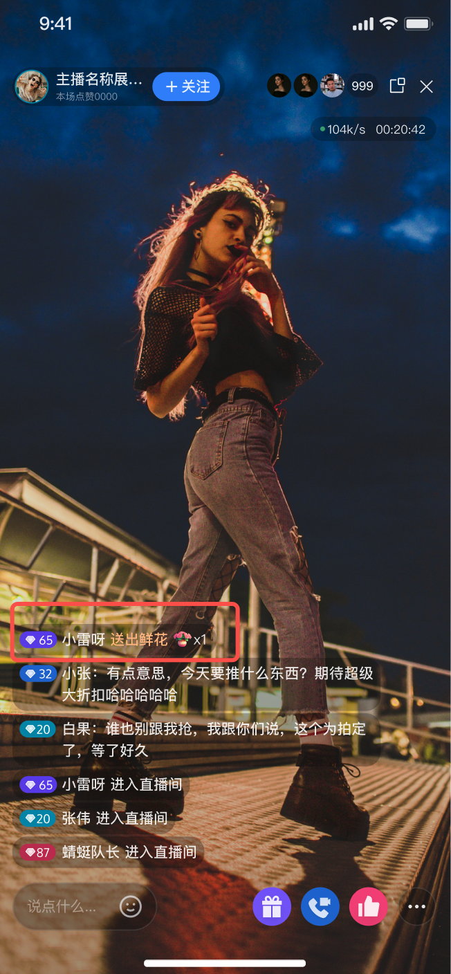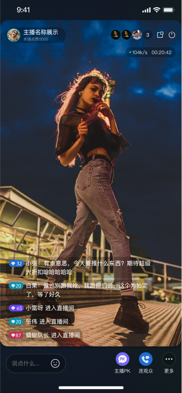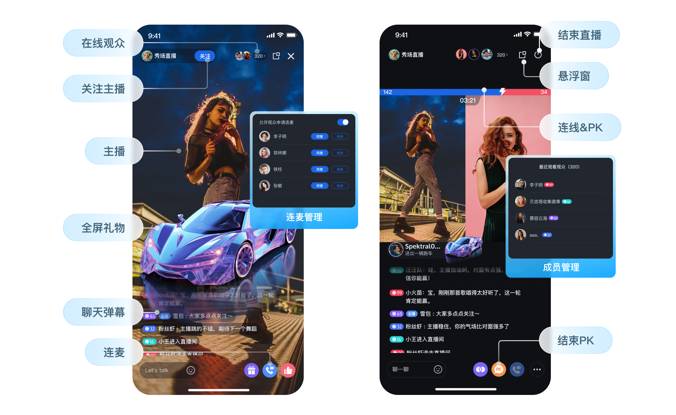 直播互动:弹幕消息、送礼点赞、单房间连麦、跨房连线 / PK