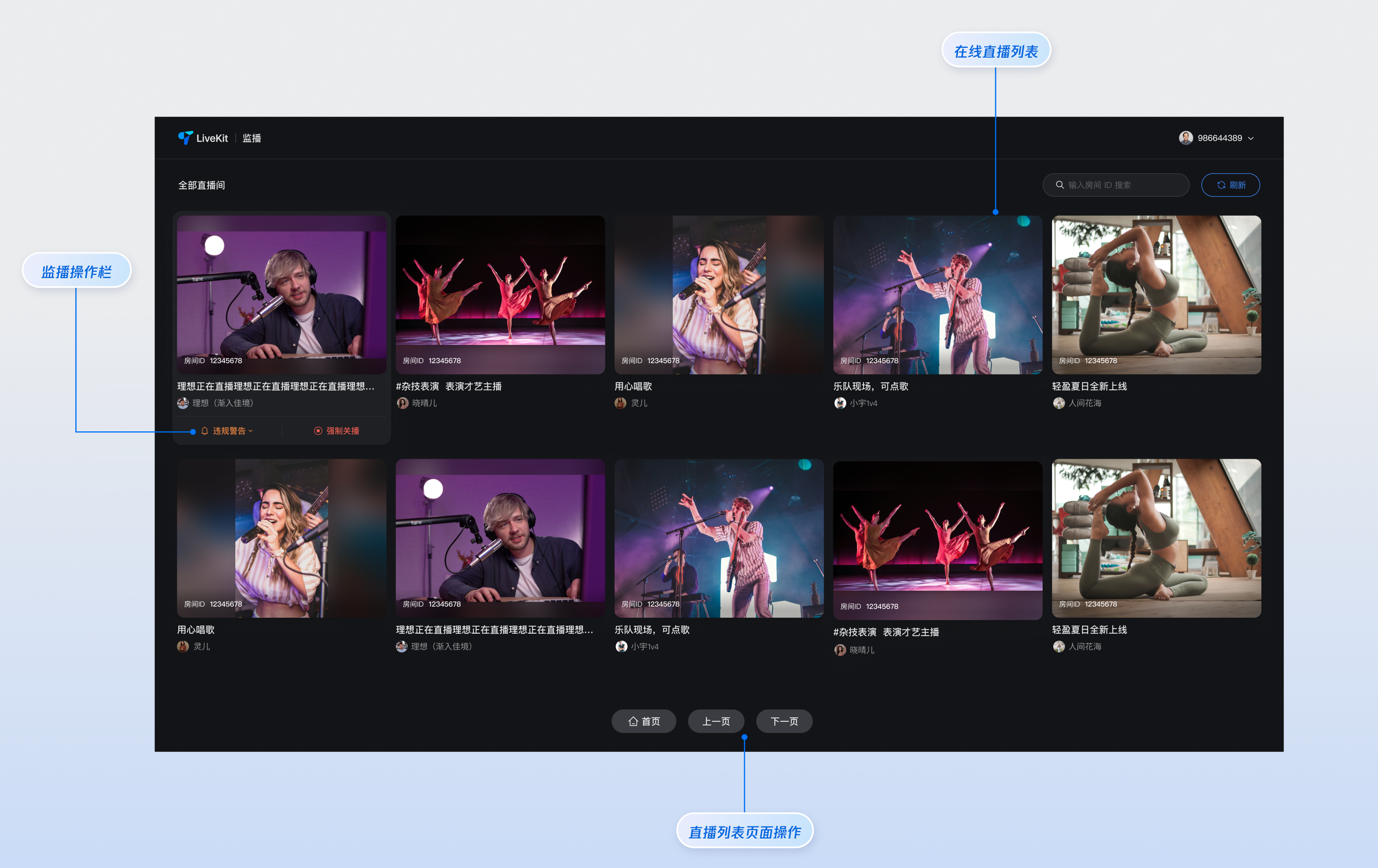为方便您实时管理和监控您的直播间,Live 提供了直播监播的能力,可查看当前直播间,并可直接解散指定直播间。