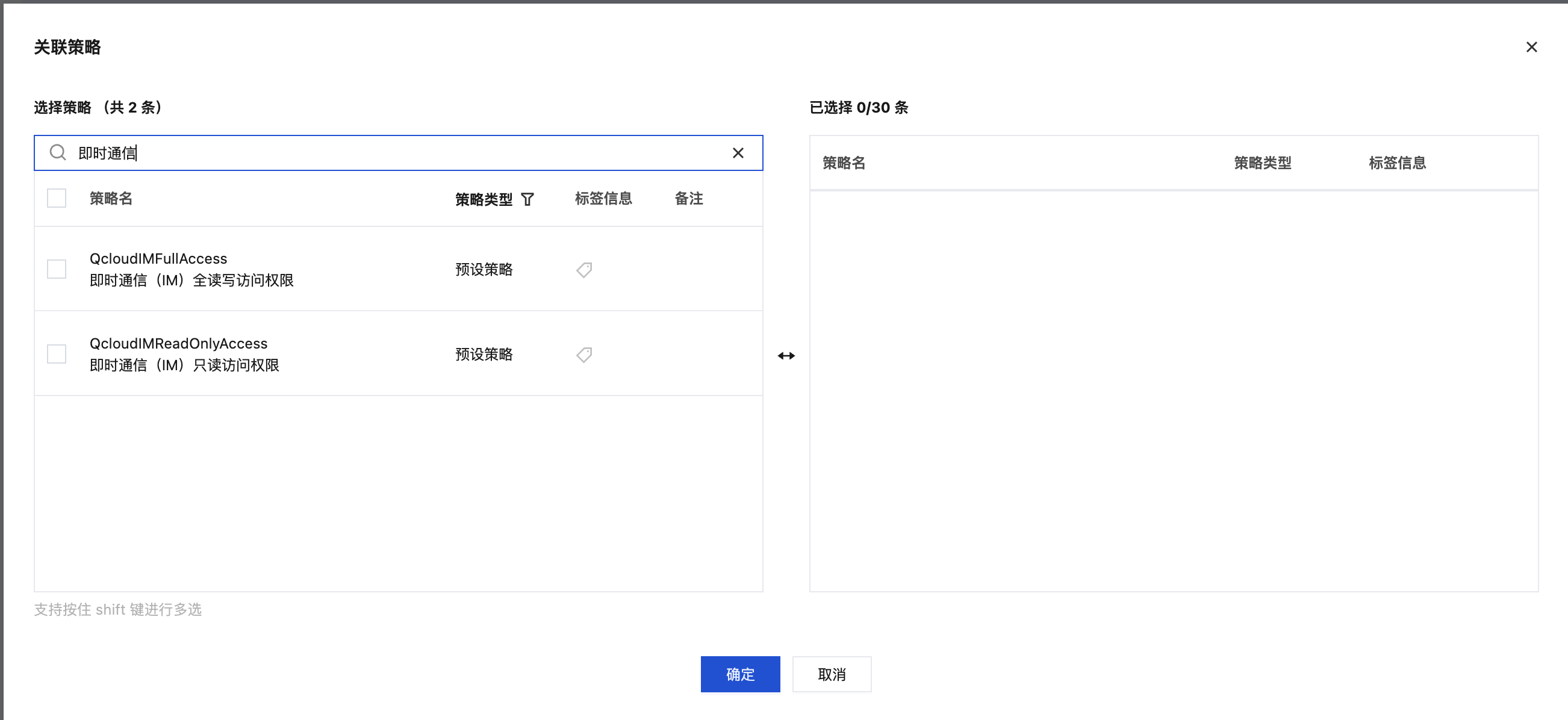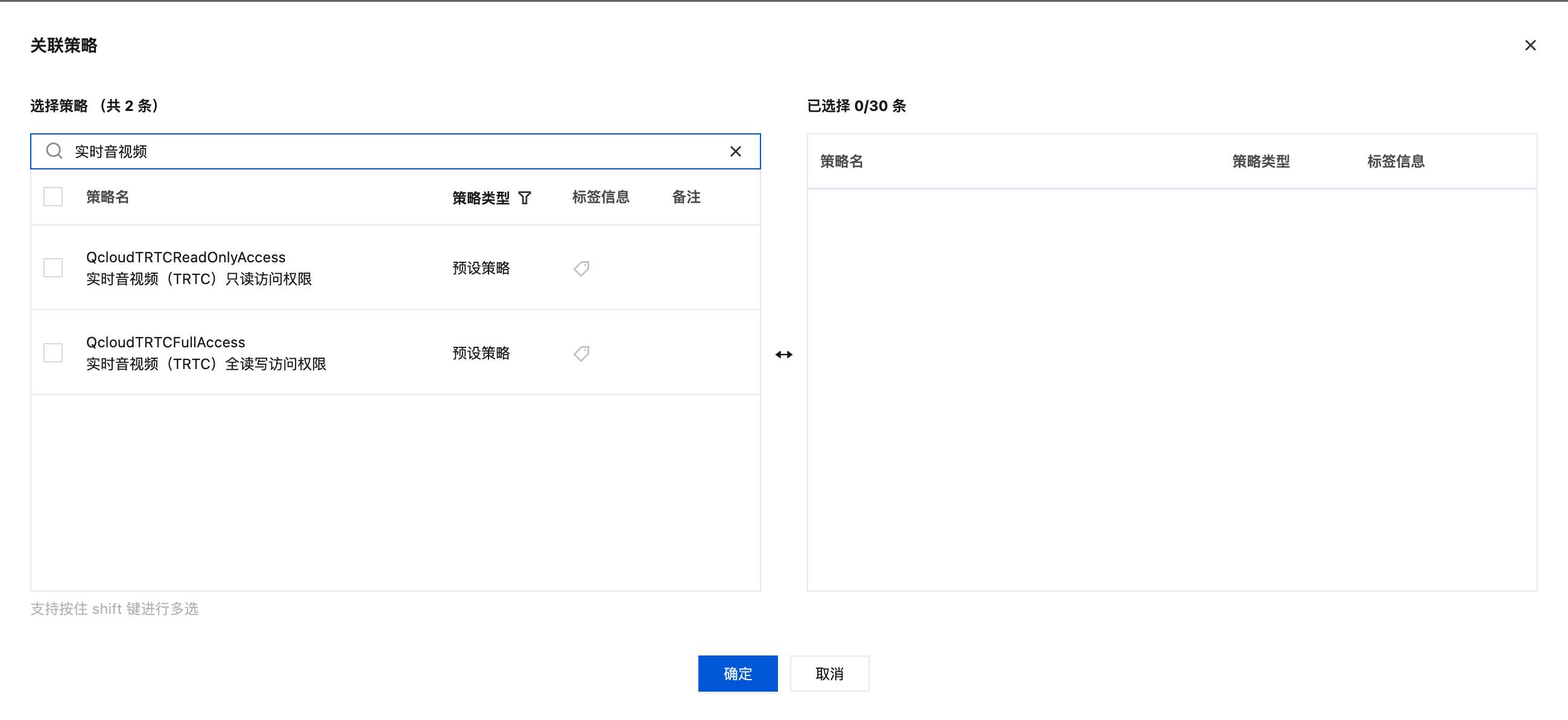 在策略筛选框,分别搜索即时通信和实时音视频,勾选需要授权的选项,单击确定即完成授权。