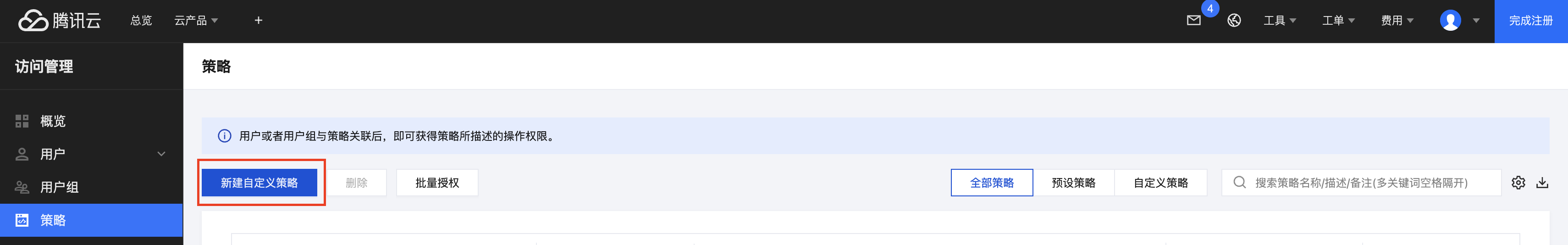 右上角提示关联策略成功即完成关联操作。