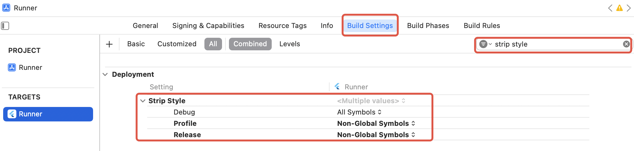 2. 在项目的 Build Settings 中找到 Strip Style,将其中 Release 的值设置为 Non-Global Symbols 。