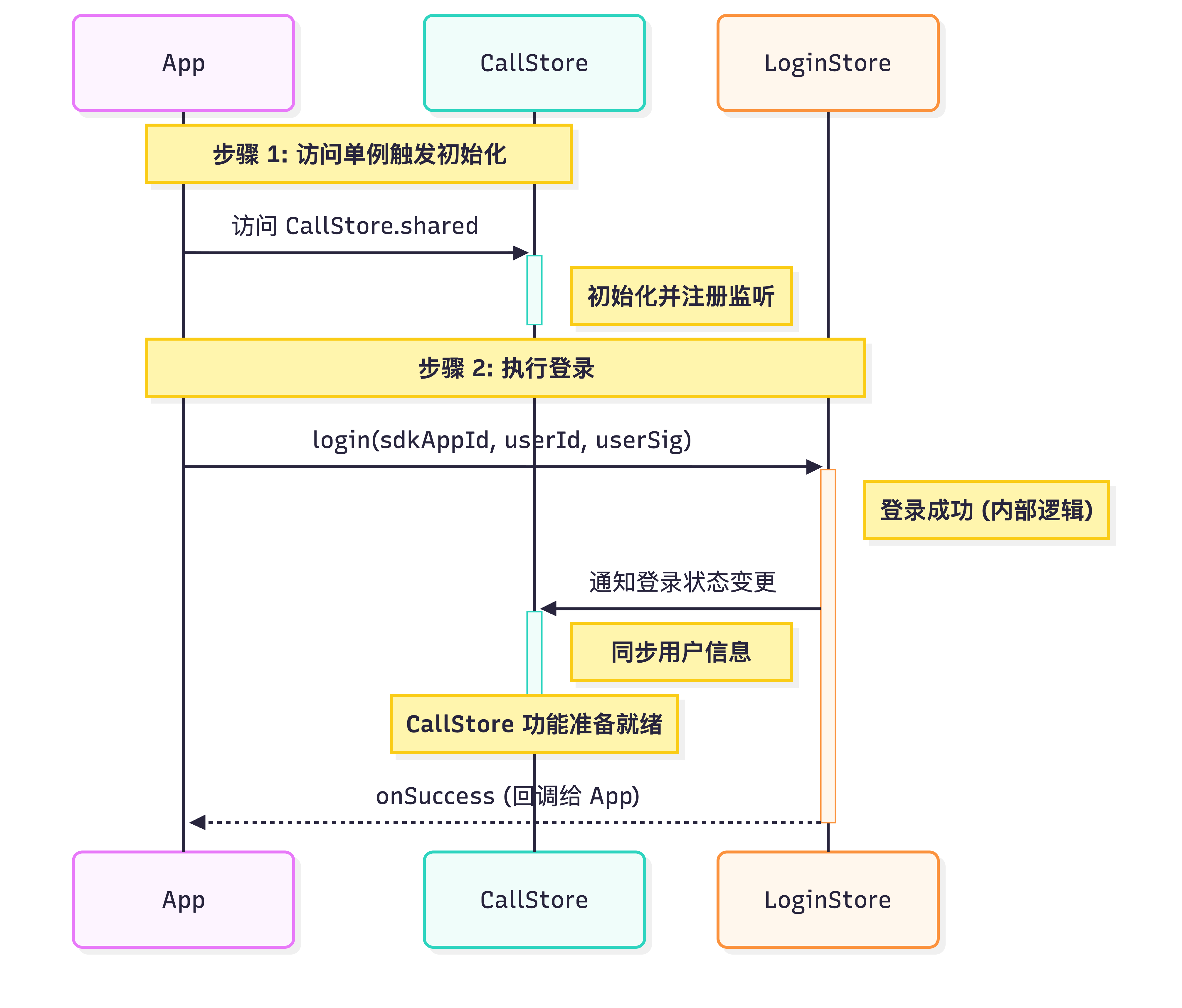 启动通话服务需依次完成 CallStore 初始化与用户登录。CallStore 通过监听登录成功事件自动同步用户信息,从而进入就绪状态。流程图与示例代码如下: