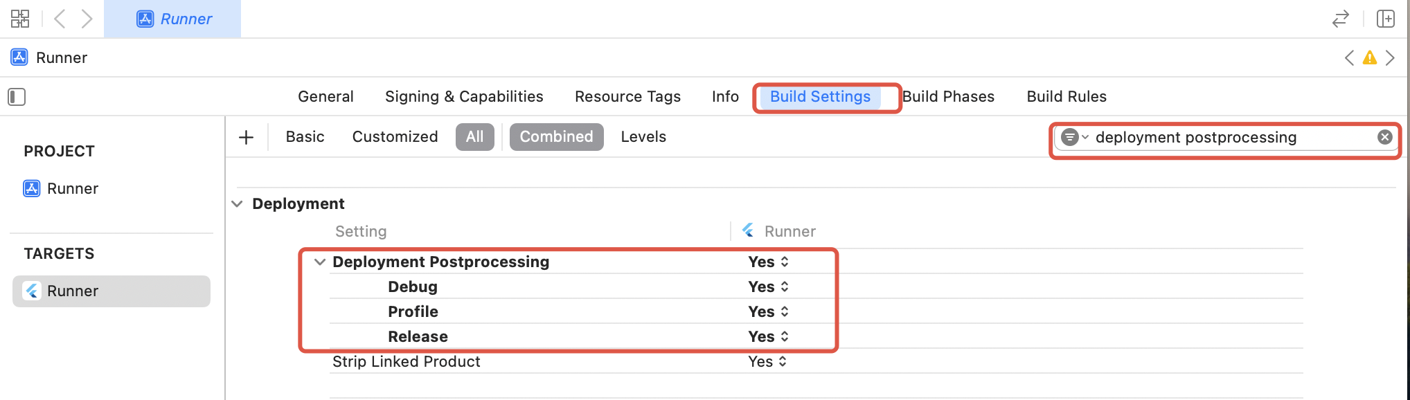 2. 在项目的 Build Settings 中找到 Strip Style,将其中 Release 的值设置为 Non-Global Symbols 。