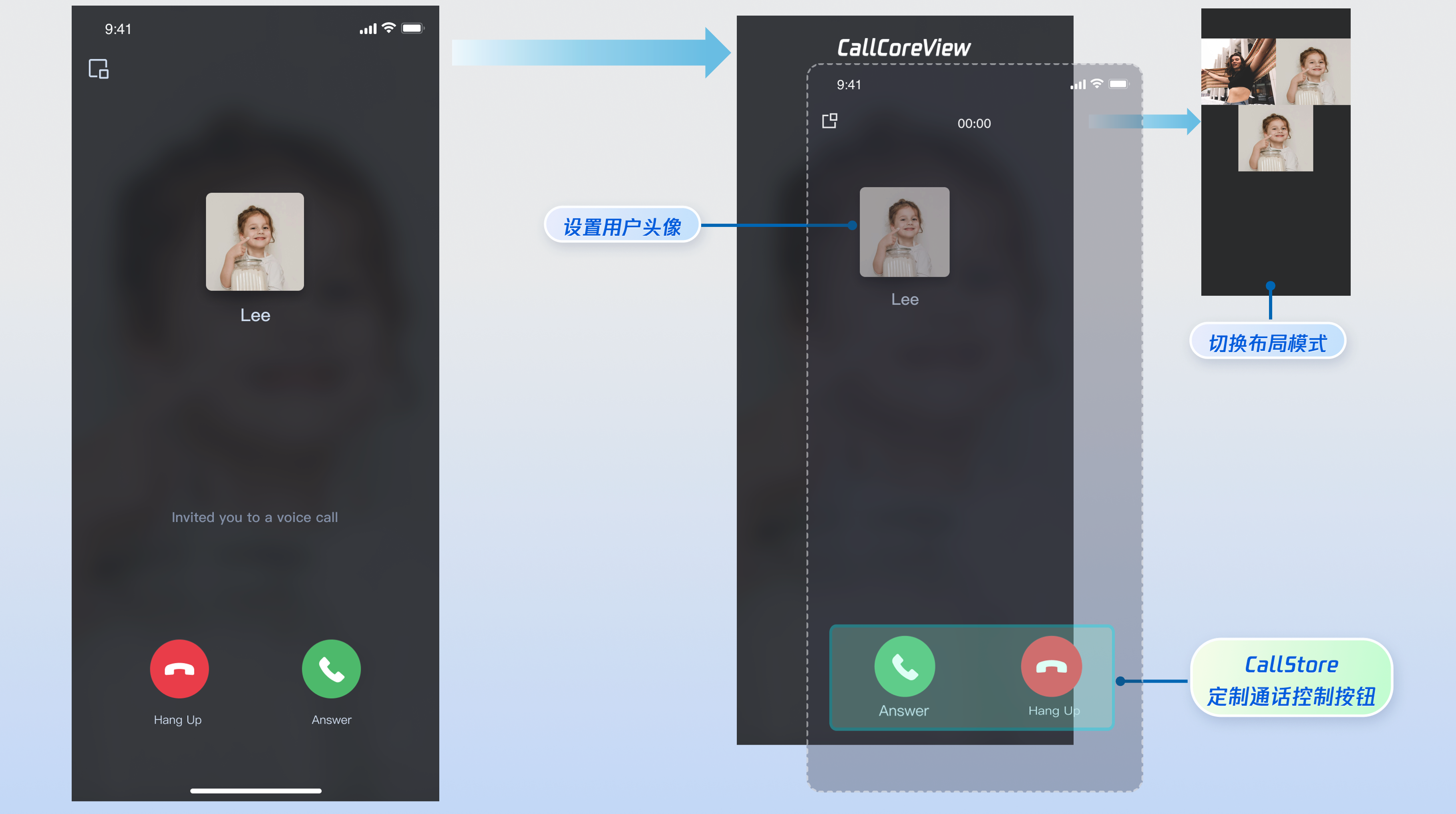 通话视图核心 Widget。自动监听 CallStore 数据并完成画面渲染,同时支持 1v1 和多人通话布局自动切换。 | |