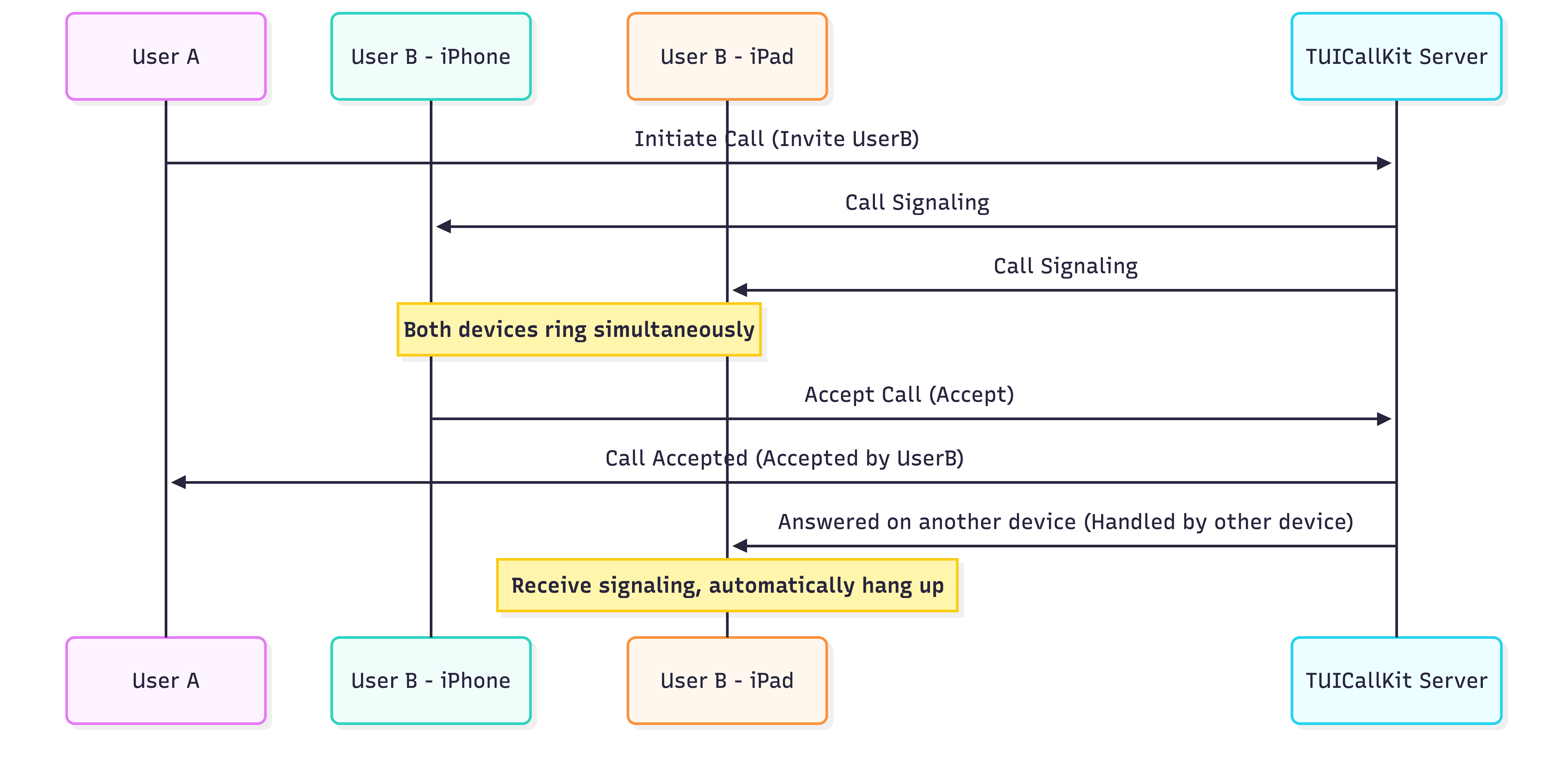 不会。TUICallKit 的信令后台具有原子性处理机制,它只认第一个到达的“接听”请求。一旦确认了一个接听设备,就会立刻向其他设备发送“取消”指令,确保通话的唯一性。